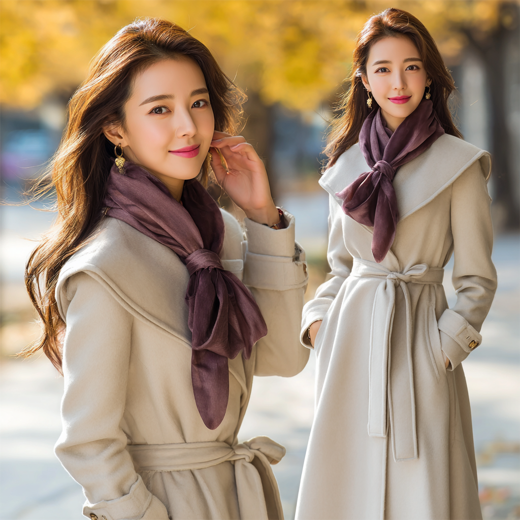 저는 베이지 코트에 와인색 머플러를 가장 즐겨 착용해요. 얼굴 톤이 따뜻해 보이면서 세련된 느낌을 주거든요.