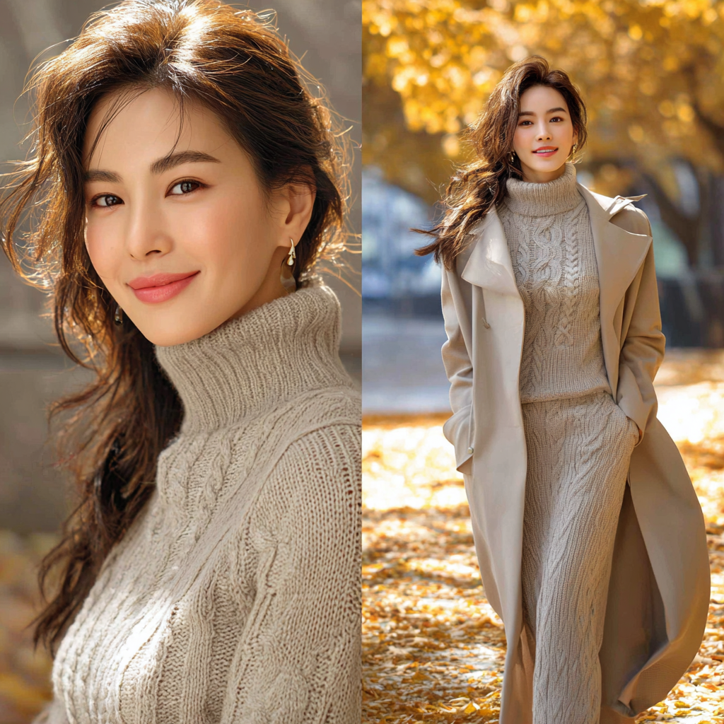 실제로 제가 촬영했던 화보에서는 베이지 하이넥 니트에 체크 슬랙스를 매치했는데, 따뜻하면서도 세련된 감성이 완성되었어요.