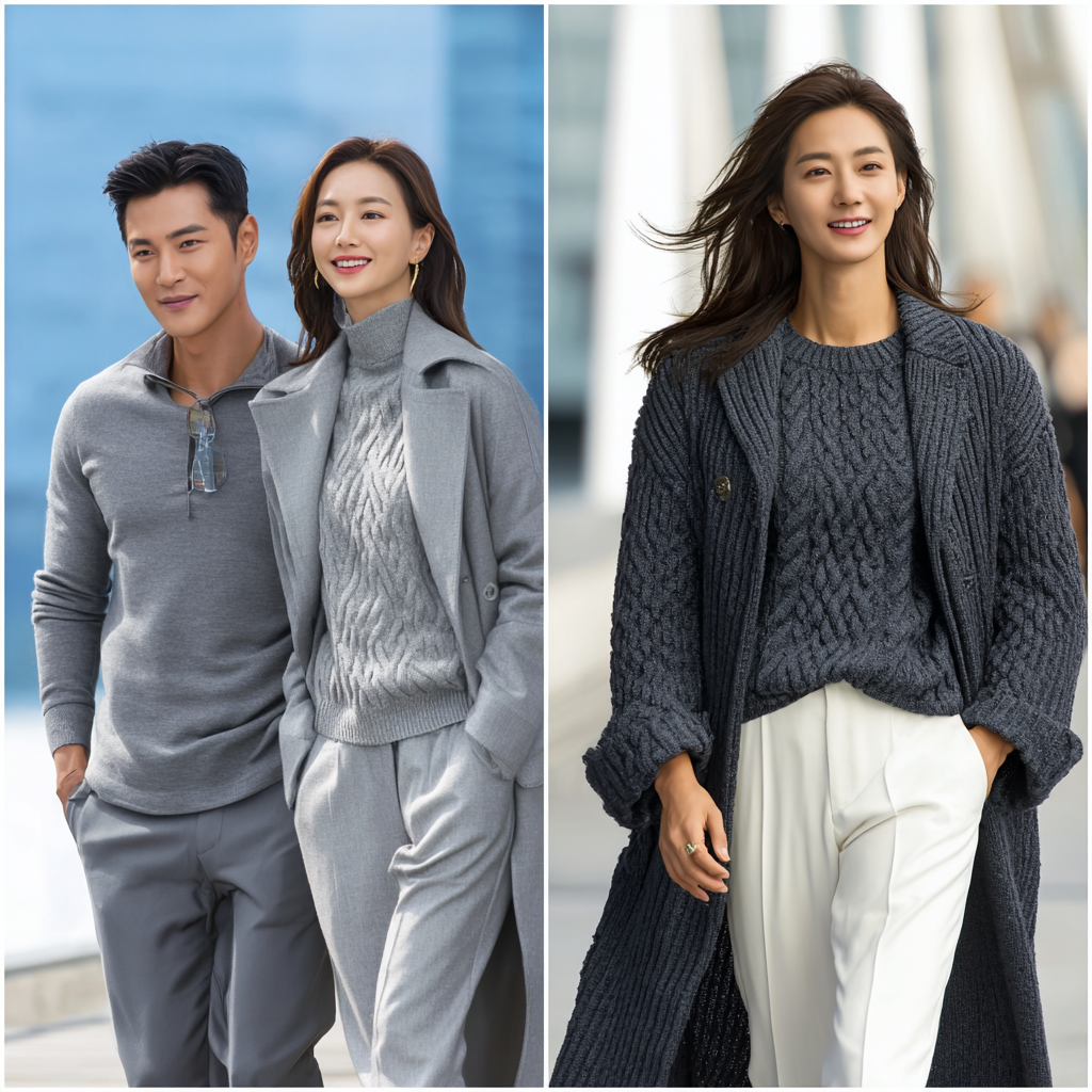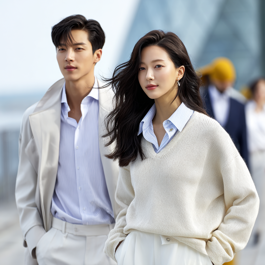 남성은 재킷과 니트 조합이 깔끔하고, 여성은 셔츠 + 베스트 + 플리츠스커트 조합이 우아해요. 실제로 제가 촬영했던 여성 모델의 룩북에서도 셔츠 + 니트 베스트 + 롱스커트가 가장 반응이 좋았습니다.