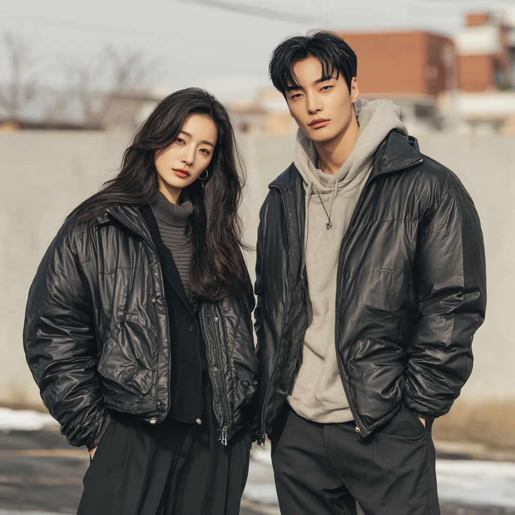 여성 코디: 라이더 자켓 + 미디 스커트 + 앵클부츠 조합은 겨울 데이트룩으로 손색없어요. 여기에 크로스백이나 미니백을 더하면 페미닌 무드 완성. 베이지 니트와 브라운 가죽 조합은 따뜻하면서 세련된 인상을 줍니다.