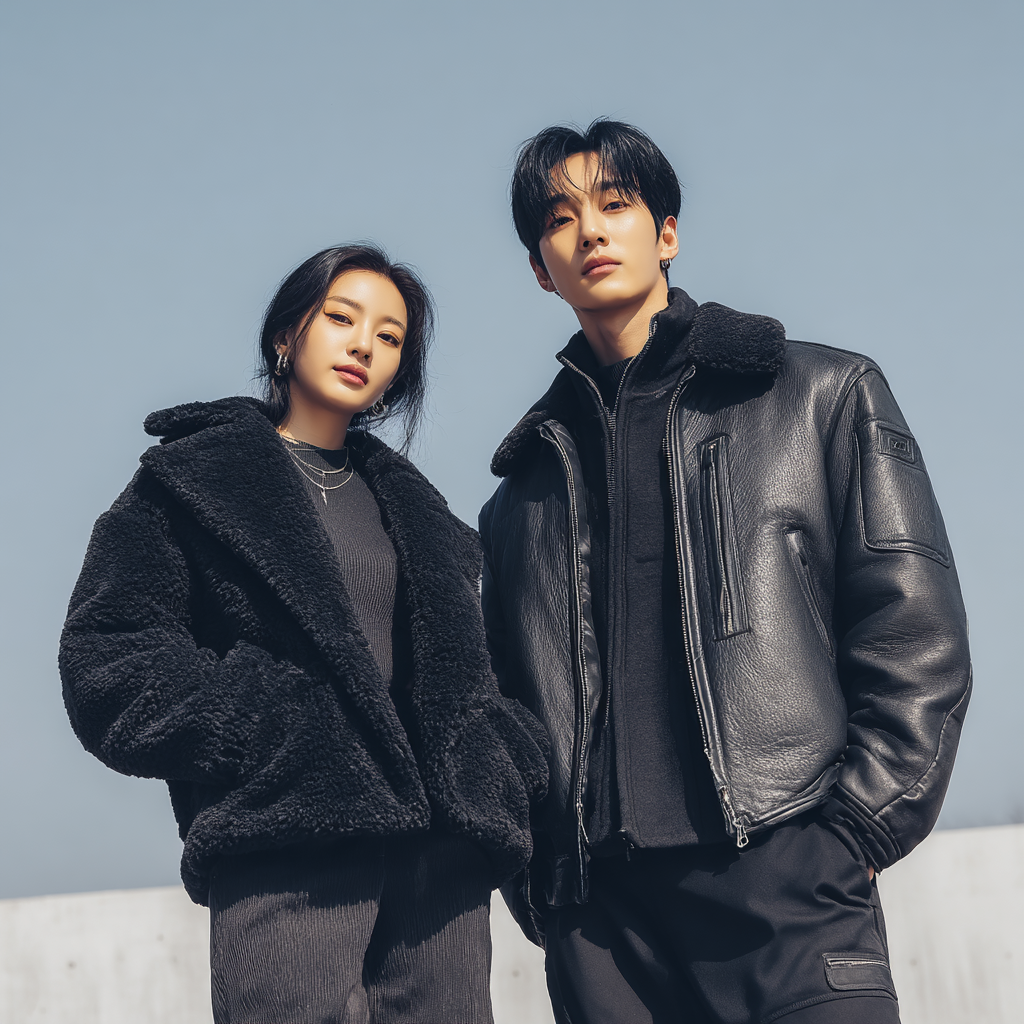 여성 코디: 라이더 자켓 + 미디 스커트 + 앵클부츠 조합은 겨울 데이트룩으로 손색없어요. 여기에 크로스백이나 미니백을 더하면 페미닌 무드 완성. 베이지 니트와 브라운 가죽 조합은 따뜻하면서 세련된 인상을 줍니다.