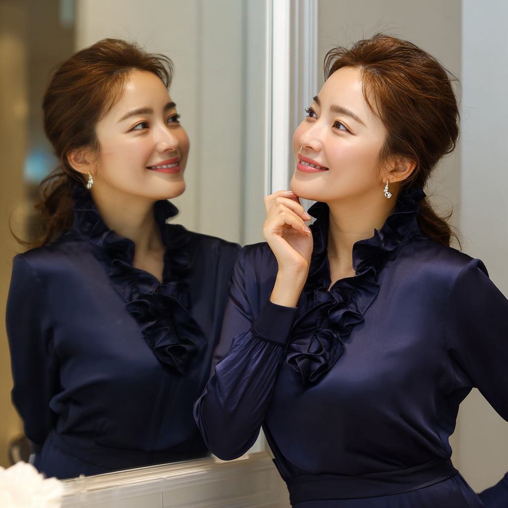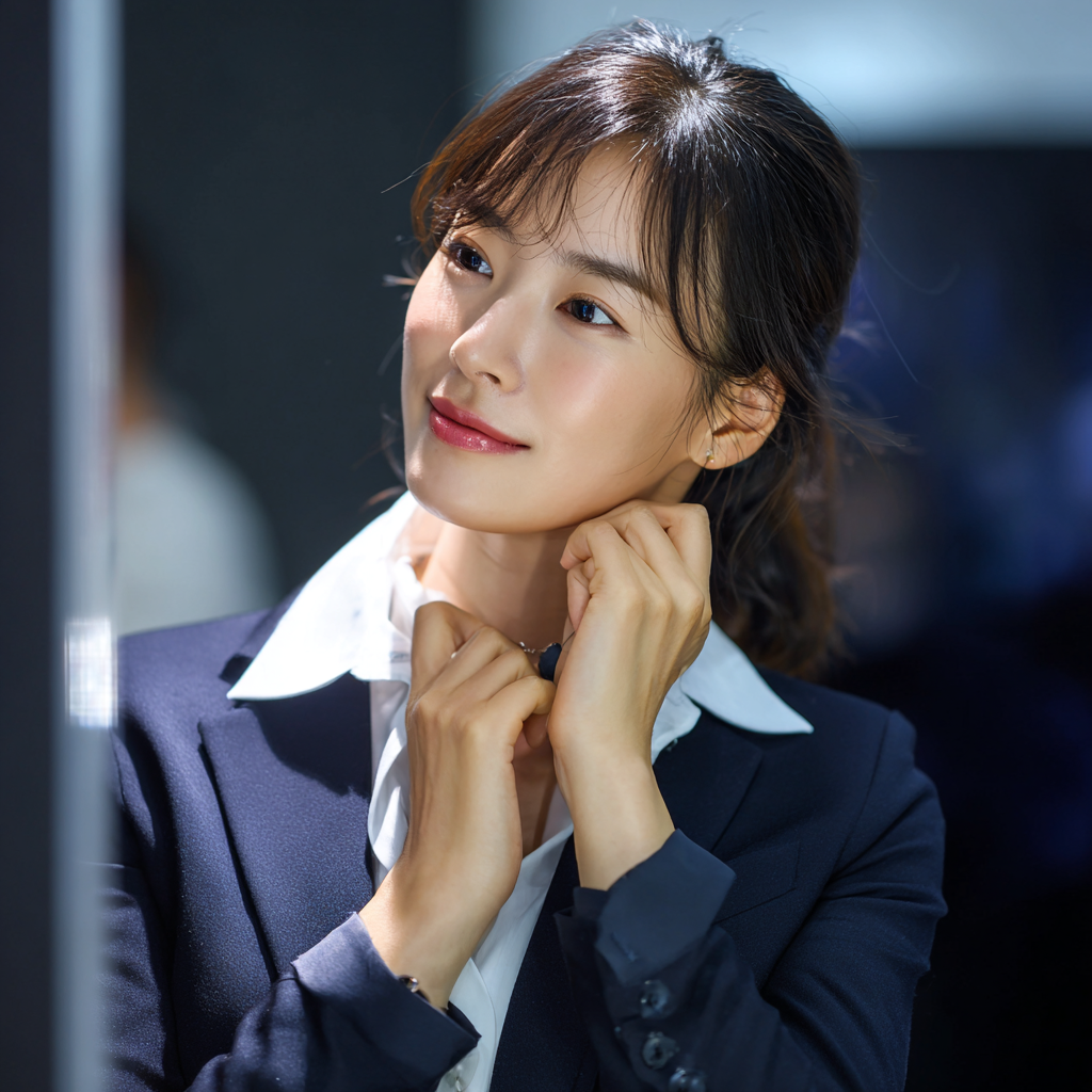 제가 면접 때 입은 ‘브이넥 블라우스 + 라펠 좁은 네이비 자켓’ 조합이 바로 이 공식이에요. 얼굴과 목이 시원해 보이고, 상체 부피가 확 줄어든 인상을 받았습니다.
