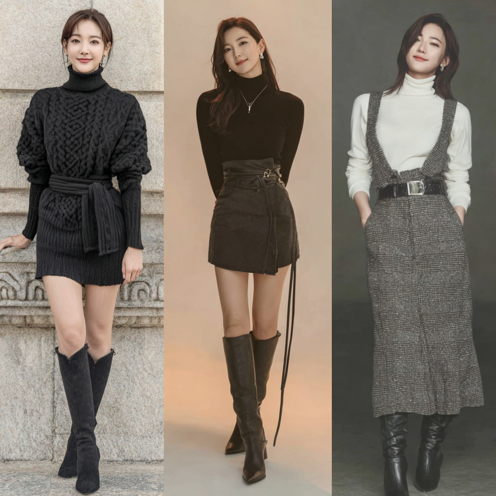 실제로 제가 니하이 부츠를 처음 신었을 때, 전체 밸런스가 무너졌었어요. 이후 미디스커트와 함께 입자 훨씬 세련되어 보였죠. “부츠는 노출 밸런스의 예술”입니다.